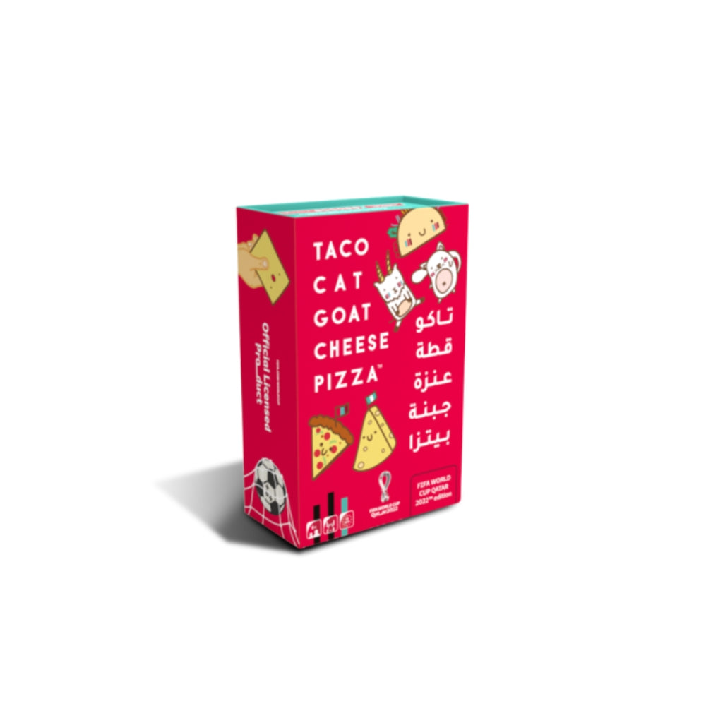 The official FIFA Qatar World Cup edition of Taco Cat Goat Cheese Pizza is here!In a game of Taco Cat Goat Cheese Pizza, each player places a card from their hand, face up, into a community pile, while saying one of the following words:"Taco!", "Cat!", "Goat!", "Cheese!", "Pizza!" in player sequence.When the card matches the mantra just said — BOOM! — everyone slaps their hand on the deck, with the last one to slap picking up all the cards in the pile.Whoever rids themselves of all their cards first, wins!In this limited edition FIFA version of the beloved game, characters are now cheering for their favorite national football teams and the special cards relate directly to the sport as well!